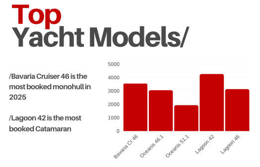 Once again, the Bavaria Cruiser 46 is the most popular monohull of 2025 keeping his position as market leader followed by Oceanis 46.1 and Oceanis 51.1. On the Catamaran side the Lagoon 42 has the the highest number of booked weeks followed by the Lagoon 46.