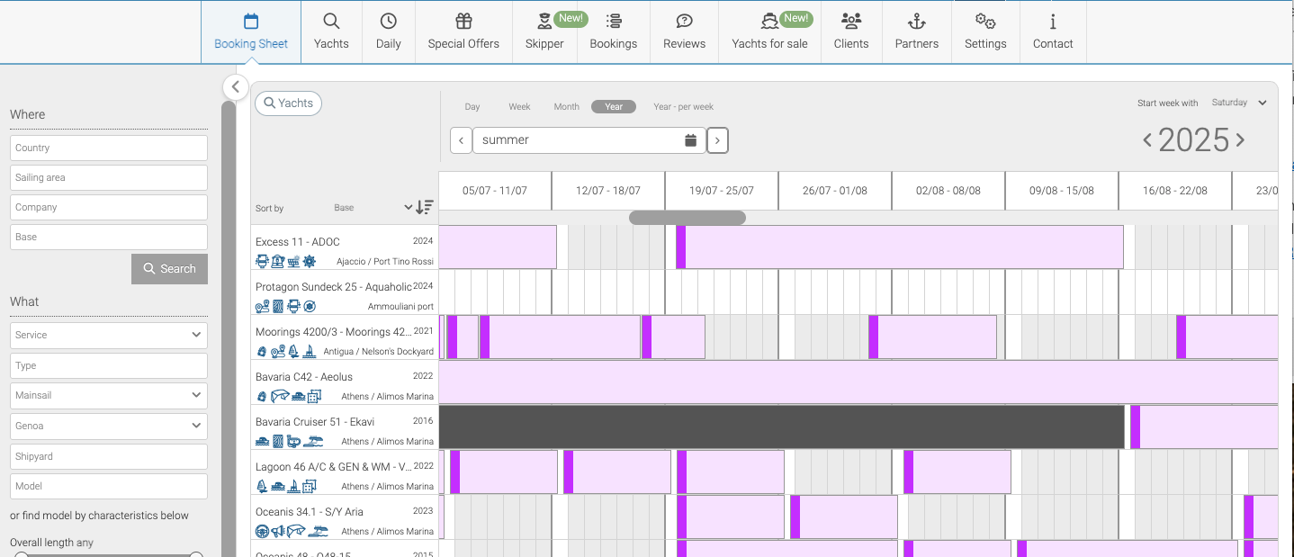 Standard Booking Sheet is available with classic view per fleet as well as the powerful display with all yachts in certain base or sailing area visible at once.